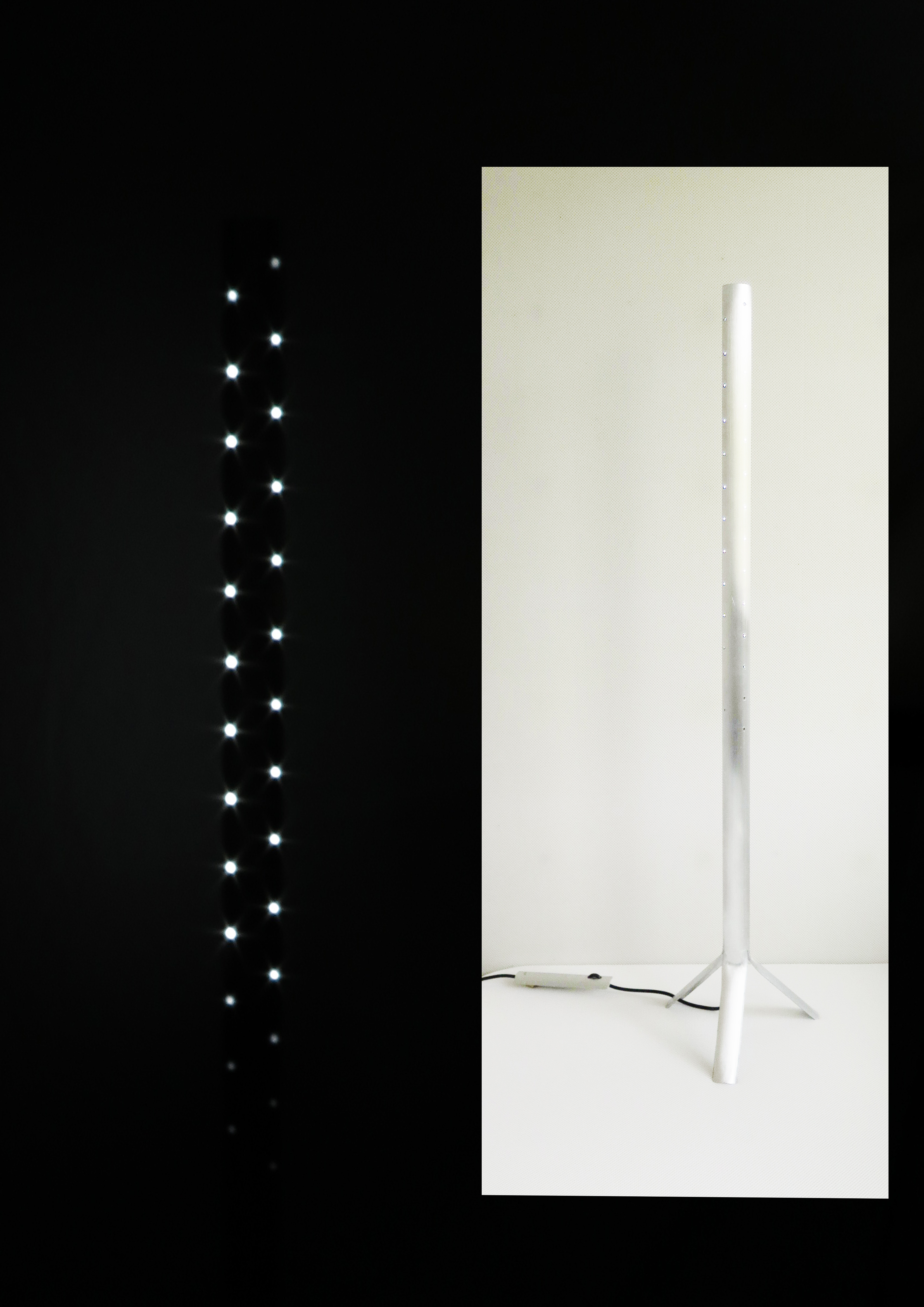 Lamp part of theater scenery. Optimizing the use of available material and saving costs we propose these floor lamps of low intensity and consumption, each one made from an aluminum tube worked by cutting and drilling.